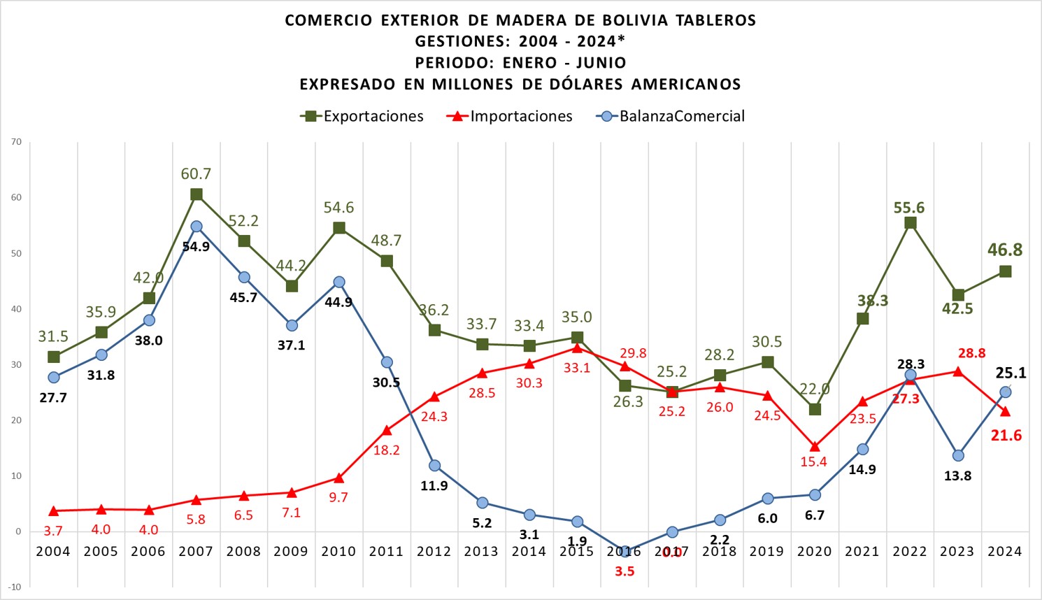 Por otro lado, las importaciones de productos de madera han disminuido casi un 25%, bajando de los $us 28,8 millones a $us 21,6 millones en relación al primer semestre de la gestión pasada, lo que también destaca un cambio favorable en la balanza comercial, de acuerdo con el informe.