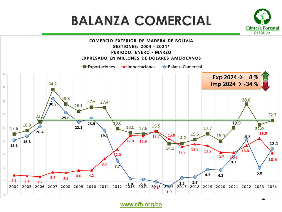 En los primeros tres meses de la gestión 2024, las exportaciones forestales ascendieron a $us 22,7 millones, lo que representa un incremento del 8% en comparación con los $us 21 millones de dólares exportados en el mismo periodo del 2023, según el reporte de la la Cámara Forestal de Bolivia (CFB).