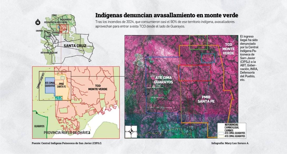 Ni bien acabaron los incendios en noviembre de 2024, ya en diciembre el equipo de monitoreo satelital de la Central Indígena Paiconeca de San Javier (CIPSJ) constató la apertura de caminos desde el lado de Guarayos, específicamente de la Autorización Transitoria Especial (ATE), o ex concesión Forestal Vasber, avasallada desde hace varios años, justo cuando tocaba renovar el permiso para continuar con el manejo forestal.